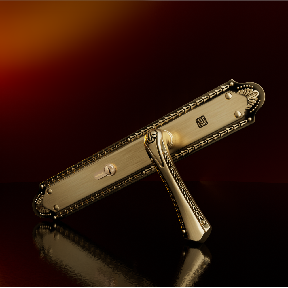 Tay ốp khóa sản xuất bằng vật liệu đồng vàng (đồng thau) tạo xước bề mặt giúp sản phẩm thêm phần ấn tượng.