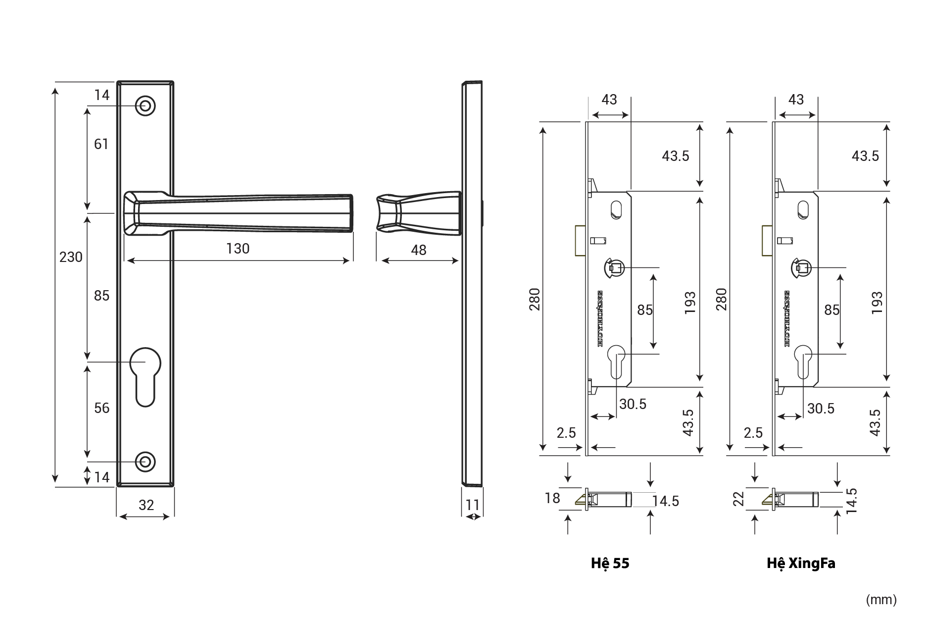 Sản phẩm khóa tay nắm TNAPEX68-ABC : có 2 phiên bản thân phù hợp với các loại nhôm hệ thông dụng như Hệ 55, Hệ XingFa... và 2 phiên bản ốp phụ phù hợp cho các loại cửa 1 cánh hoặc 2 cánh.