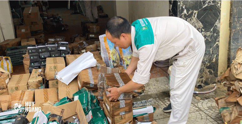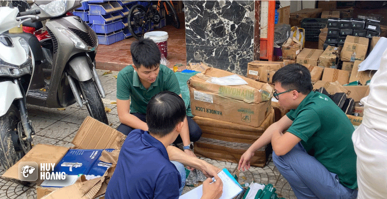 Đội ngũ nhân viên Khóa Huy Hoàng đến từng đại lý hỗ trợ dọn dẹp, thu gom sản phẩm bị lỗi do ảnh hưởng mưa bão