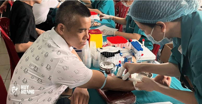 CBCNV Huy Hoàng được các bác sĩ lấy máu xét nghiệm, đây là một phần khám quan trọng trong hoạt động khám sức khỏe định kỳ mà công ty tổ chức hàng năm.